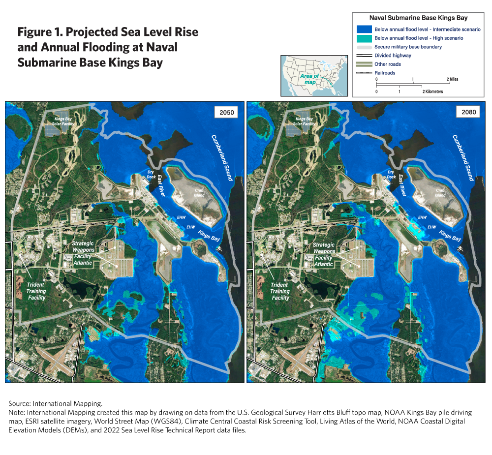 - Naval Submarine Base Kings Bay is vulnerable to rising sea levels and flooding that could significantly affect its capacity to service U.S. ballistic missile submarines (SSBNs). Because Kings Bay is one of two bases equipped to support the U.S. SSBN fleet, climate change effects there could have serious repercussions for the broader deterrence mission of the submarine leg of the nuclear triad.